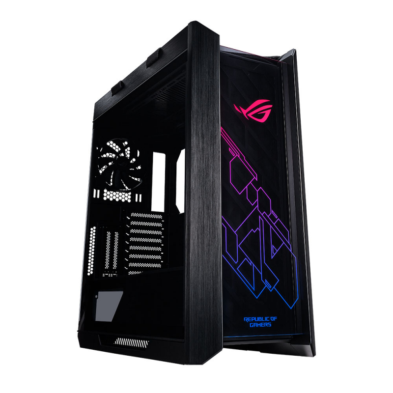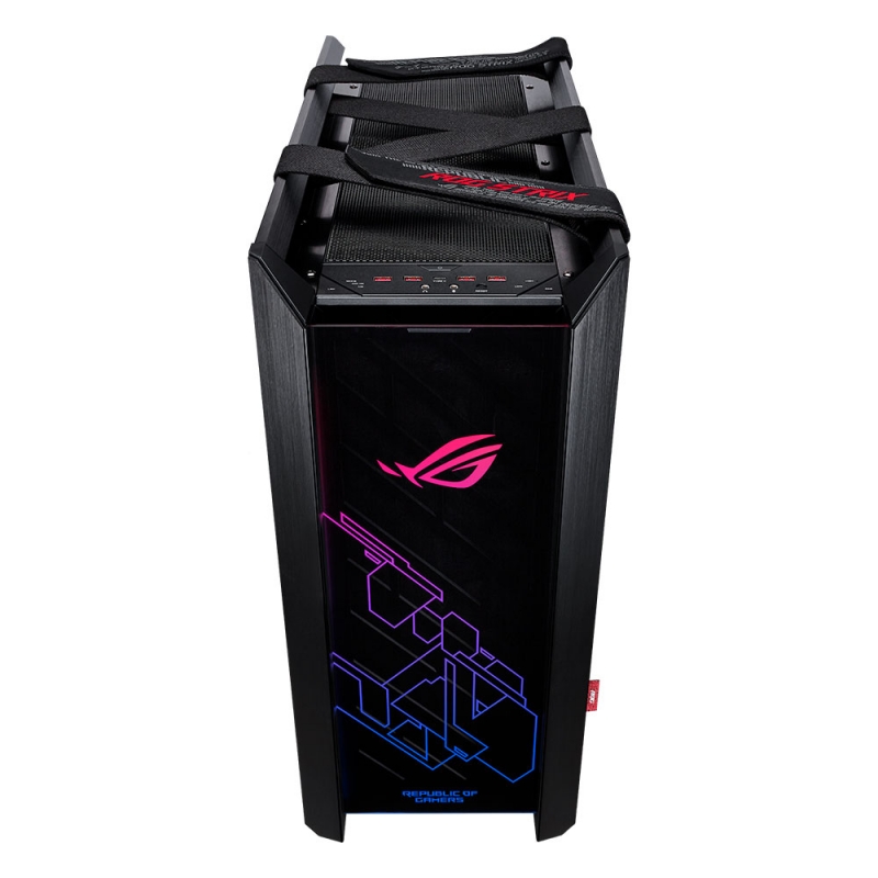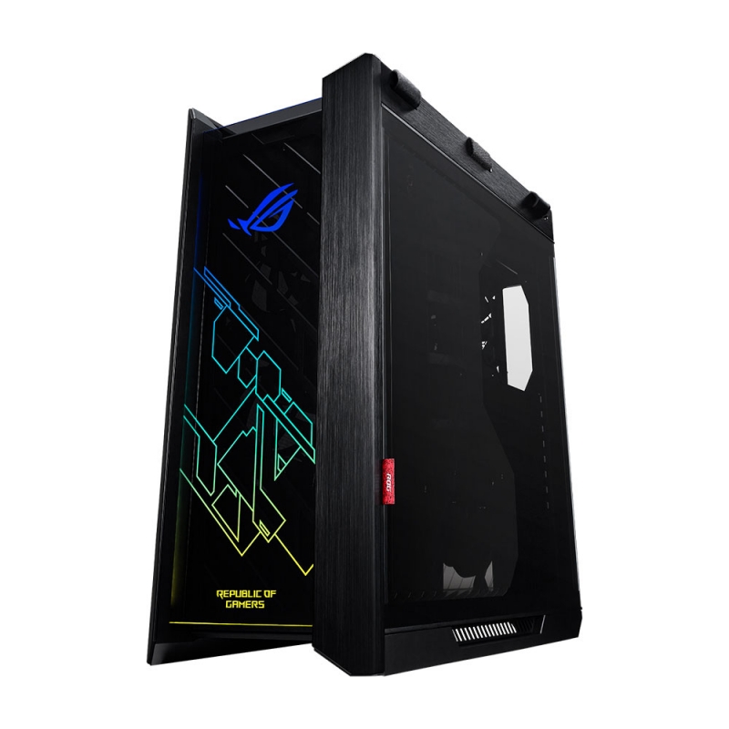 Design e estética premium. A ROG Strix Helios é feita para demonstrações, com três painéis em vidro temperado.