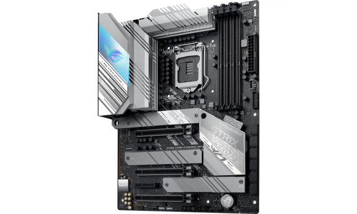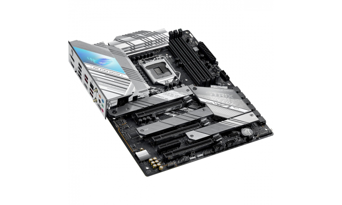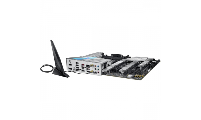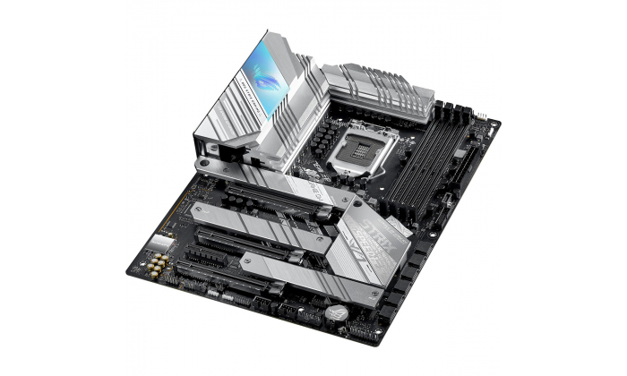 Motherboard Intel® Z590 LGA 1200 ATX com PCIe 4.0, 14 + 2 estágios de energia agrupados, cancelamento de ruído AI bidirecional, Overclocking AI, refrigeração AI, Rede AI, WiFi 6 (802.11ax), Ethernet Intel® 2.5 Gb, três M.2 slots com dissipadores de calor, USB 3.2 Gen 2x2 USB Type-C®, iluminação SATA e Aura Sync RGB.