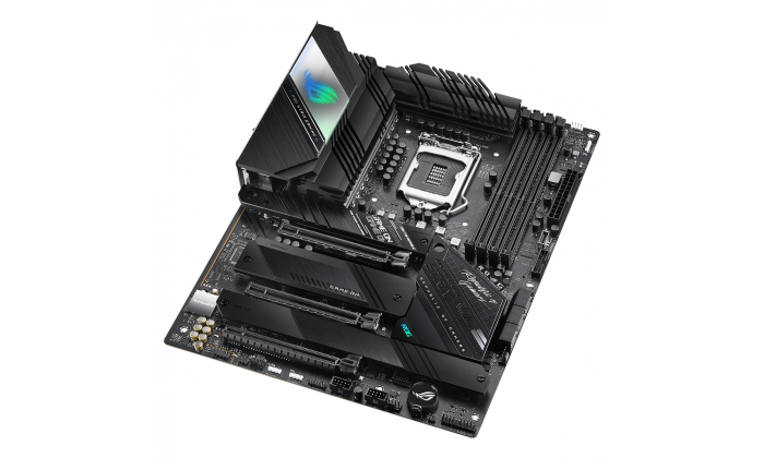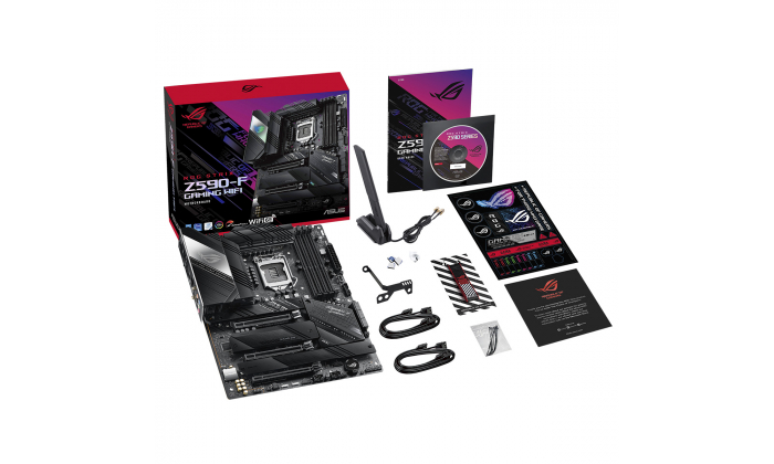 Motherboard Intel® Z590 LGA 1200 ATX com PCIe 4.0, 14 + 2 estágios de energia agrupados, cancelamento de ruído AI bidirecional, Overclocking AI, refrigeração AI, Rede AI, WiFi 6E (802.11ax), Ethernet Intel® 2.5 Gb, quatro M. 2 slots com dissipadores de calor, USB 3.2 Gen 2x2 USB Type-C®, iluminação SATA e Aura Sync RGB.