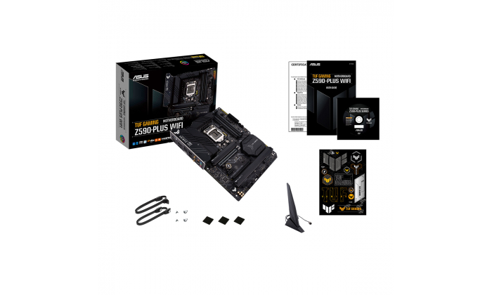 Motherboard Intel® Z590 (LGA 1200) ATX com 16 estágios de potência DrMOS, PCIe® 4.0, três slots M.2, Intel® WiFi 6 e 2.5 Gb Ethernet, HDMI®, DisplayPort™, USB 3.2 Gen 2x2 Type-C®, SATA 6 Gbps, painel frontal USB 3.2 Gen 1 Type C®, suporte Thunderbolt™ 4 e iluminação Aura Sync RGB.