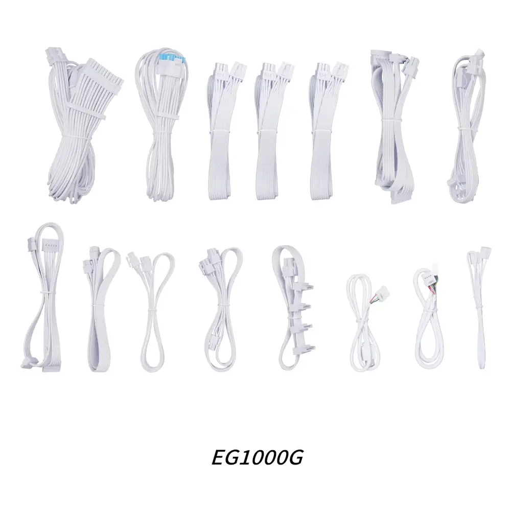 Design em formato de L adaptado para caixas de câmara dupla Eficiência 80 PLUS Gold PCIe 5.1 pronto com P&D interno Terminais soldados em liga de cobre 12V-2×6 Hub USB destacável com 4 conectores USB 2.0 internos e 6 conectores PWM Filtro de pó magnético removível para ventilador Construído com capacitores EPCOS alemães de ponta e de nível industrial Cabos de textura trançada totalmente modulares com pentes de cabo pré-instalados em conectores MB/CPU/GPU
