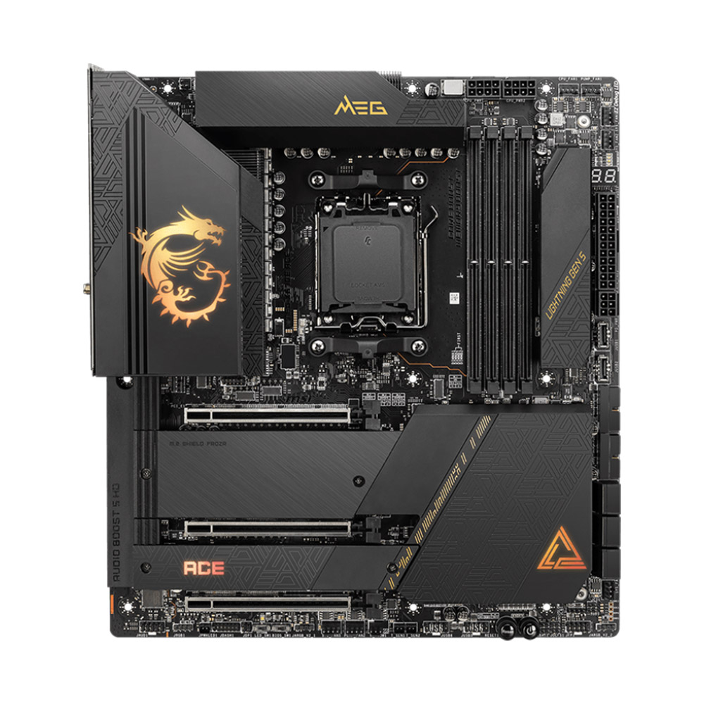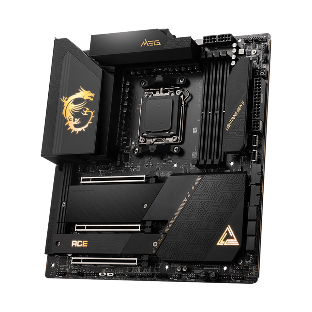 Suporta processadores de secretária da série AMD Ryzen™ 7000 Suporta memória DDR5, até 6000+(OC) MHz Desenho melhorado de energia: 14+2+1 Duet Rail Power System, conectores duplos de 8 pinos de energia para CPU, Core Boost, Memory Boost Experiência de jogo Lightning rápido: slot PCIe 5.0, Lightning Gen5 M.2, USB 3.2 Gen 2x2 Solução Térmica Premium: Design de dissipador de calor prolongado e M.2 Shield Frozr são construídos para sistemas de alto desempenho e trabalhos sem paragens