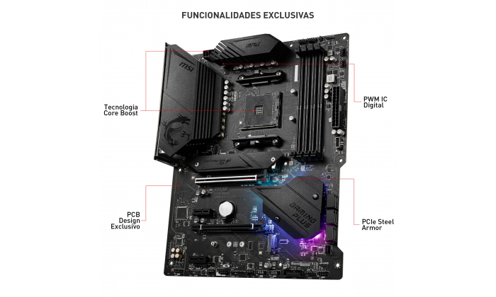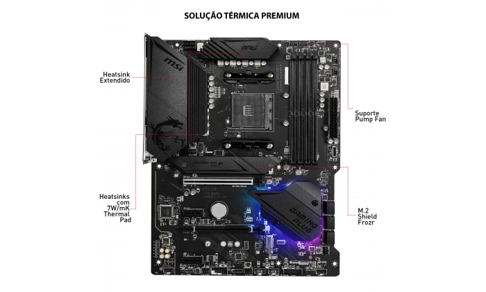 JOGUE EM ESTILO A série MPG traz o melhor dos jogadores, permitindo a expressão total em cores com controlO e sincronização avançados de iluminação RGB. Experimente outro nível de personalização com uma faixa de LED frontal que fornece notificações convenientes no jogo e em tempo real. Com a série MPG, transforme o seu equipamento no centro das atenções e nas melhores tabelas de classificação em grande estilo. DESIGN DE HARDWARE PREMIUM Com anos de experiência, a MSI já está habituada à construção de motherboards de alto desempenho. As nossas equipas de P&D e engenharia conferem inúmeros projetos, avaliaram uma ampla seleção de componentes de alta qualidade e desenvolveram produtos para confiabilidade, mesmo sob condições extremas. SOLUÇÃO TÉRMICA PARA MAIS NÚMEROS E DESEMPENHO MAIS ALTO Com os processadores de mais núcleos, o design térmico e de energia é mais importante para garantir que a temperatura continue mais baixa. O dissipador de calor PWM estendido da MSI e design de circuito aprimorado garantem que a CPU de alto desempenho funcione a toda velocidade com as motherboards MSI. DESEMPENHO MELHORADO As motherboards MSI de alto desempenho são carregadas com recursos avançados e a mais recente tecnologia para superar qualquer desafio em questão, independentemente de ser um jogador, um prosumer ou um entusiasta de PC. EXTREMO ESTABILIDADE E TESTE DE COMPATIBILIDADE A MSI realiza testes completos de memória com as marcas de memória mais populares sob condições extremas para garantir que o seu sistema funcione estável, não importa o quê. Os nossos parceiros de memória incluem marcas como Corsair, Crucial, Kingston, G.Skill e muito mais para melhorar módulos de memória, configurações e até melhorar o overclocking. CONECTIVIDADE As motherboards MSI são construídas com uma variedade de conectores para satisfazer os jogadores. Áudio aprimorado, recursos avançados de rede LAN, USB e Mystic Light tornam qualquer experiência de jogo imersa. Processador: Suporta AM4 socket 3rd Gen AMD Ryzen™ e o futuro AMD Ryzen™ com update BIOS Chipset: AMD B550 Memória RAM: 4 x DIMM socket suporta até 128 GB Suporta DDR4 1866/ 2133/ 2400/ 2667/ 2800/ 2933/ 3000/ 3066/ 3200 MHz by JEDEC Suporta DDR4 2667/ 2800/ 2933/ 3000/ 3066/ 3200/ 3466/ 3600/ 3733 / 3866/ 4000/ 4133/ 4266/ 4400+ MHz by A-XMP OC MODE Arquitetura de memória Dual Channel Suporta non-ECC UDIMM memory Suporta ECC UDIMM memory (non-ECC mode) Suporta un-buffered memory Slots de Expansão: 1 x PCIe 4.0/ 3.0 x16 slot (PCI_E1) 1 x PCIe 3.0 x16 slot (PCI_E3), supports x4 speed 2 x PCIe 3.0 x1 slots Armazenamento: 6 x SATA 6Gb/s ports 2 x M.2 slots (Key M) M2_1 slot (from AMD Processor) Supports PCIe 4.0/ 3.0 x4 Supports SATA 6Gb/s Supports 2242/ 2260/ 2280/ 22110 storage devices M2_2 slot (from AMD B550 chipset) Supports PCIe 3.0x4 Supports PCIe 3.0x4 Supports 2242/ 2260/ 2280 storage devices LAN: 1x Realtek® 8111H Gigabit LAN controller Áudio: Realtek® ALC892 Codec 7.1-Channel High Definition Audio Portas USB: AMD B550 Chipset 3x USB 3.2 Gen 1 5Gbps ports (1 Type-C internal connector, and 2 ports are available through the internal USB 3.2 Gen 1 5Gbps connector) 8x USB 2.0 ports (4 Type-A ports on the back panel, 4 ports through the internal USB 2.0 connectors) AMD Processor 2x USB 3.2 Gen 2 10Gbps ports (1 Type-C port and 1 Type-A port on the back panel) 2x USB 3.2 Gen 1 5Gbps Type-A ports on the back panel Conectores I/O: 1x 24-pin ATX main power connector 1x 8-pin ATX 12V power connector 6x SATA 6Gb/s connectors 2x M.2 slots (M-Key) 1x USB 3.2 Gen 1 5Gbps Type-C port 1x USB 3.2 Gen 1 5Gbps connector (supports additional 2 USB 3.2 Gen 1 5Gbps ports) 2x USB 2.0 connectors (supports additional 4 USB 2.0 ports) 1x 4-pin CPU fan connector 1x 4-pin water-pump fan connector 6x 4-pin system fan connectors 1x Front panel audio connector 2x System panel connectors 1x Chassis Intrusion connector 1x 4-pin RGB LED connector 2x 3-pin RAINBOW LED connectors 1xTPM module connector 1x Clear CMOS jumper Portas Painel Traseiro: PS/2 Combo Port DisplayPort LAN Port USB 3.2 Gen 2 10Gbps (Type-A) HD Audio Connectors Flash BIOS Button USB 2.0 HDMI USB 2.0 USB 3.2 Gen 1 5Gbps (Type-A) USB 3.2 Gen 2 10Gbps (Type-C) Optical S/PDIF OUT Dimensões: Formato ATX , 30.5 cm x 24.4 cm