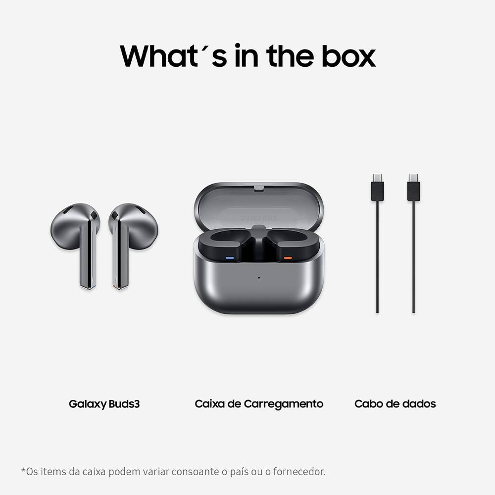 SOM E COMODIDADE FANTÁSTICOS COM GALAXY AI Apresentamos os novos Galaxy Buds3, com um novo design que se adapta a todos os tipos de utilizadores e com um som incrível. O seu som nítido de 24 bits é perfeito para os amantes da música. E tudo isto, juntamente com as nossas funcionalidades do ecossistema Galaxy, que fazem dos Galaxy Buds3 os melhores companheiros para qualquer viagem, em conjunto com funcionalidades de tradução como o intérprete ou o call assist com Galaxy AI. NOVO DESIGN COM UM AJUSTE CONFORTÁVEL Os novos Galaxy Buds3 estreiam um novo design que se adapta de forma mais confortável a todo o tipo de utilizadores. A sua nova interface de controlo é mais simples graças aos gestos de toque disponíveis na parte alongada. A sua resistência melhora para estar sempre protegidos contra qualquer incidente. RESISTÊNCIA IP57 Os novos Galaxy Buds3 melhoram a resistência em relação aos modelos anteriores. Graças à sua certificação IP57, são resistentes ao pó e à água (1m durante 30 min). CANCELAMENTO DE RUÍDO COM GALAXY AI Os Galaxy Buds3 oferecem uma melhor qualidade de som e chamadas mais claras e nítidas graças aos padrões de aprendizagem da Galaxy AI. Não se perca da sua música com o som de alta qualidade de 24 bits e com o cancelamento de ruido melhorado dos Galaxy Buds3. GALAXY AI NOS GALAXY BUDS3 A Galaxy AI chega aos Galaxy Buds3 em conjunto com o seu Smartphone com Galaxy AI para permitir usar algumas das funcionalidades de forma mais simples. Use o intérprete a partir dos Buds3 tanto em modo de audição como em modo de conversa ou traduza em tempo real uma chamada com o Call Assist. ECOSSISTEMA GALAXY COM GALAXY AI Os nossos dispositivos Galaxy funcionam melhor em conjunto. Desfrute de uma série de funcionalidades ao ligar os Galaxy Buds3, como a possibilidade de usar os auriculares com os diversos dispositivos Galaxy que tenha, como tablets, Wearables ou SmartTVs… Especificações: Som: Altifalante: 1 via 11nm (Driver dinâmico) Hi-Fi: 24bit/96kHz Controlo de ruído: Cancelamento de ruído ativo Ecossistema Galaxy: Áudio 360: Sim Auracast: Sim Auto Switch: Sim Microfones: 3 microfones (2 exteriores + 1 interior ) + VPU Conectividade: Bluetooth 5.4 Bateria: 45/500mAh (Buds / Total) Tempo de reprodução: 5/24Hr (ANC ON) 6/30Hr(ANC OFF) Tempo em chamada: 3.5/18Hr (ANC ON) / 4/20Hr (ANC OFF) Durabilidade: Resistência à água e poeira IP57 Dimensões: Buds: 18.2 x 20.3 x 31.9 mm Caixa: 58.9 x 48.7 x 24.4 mm