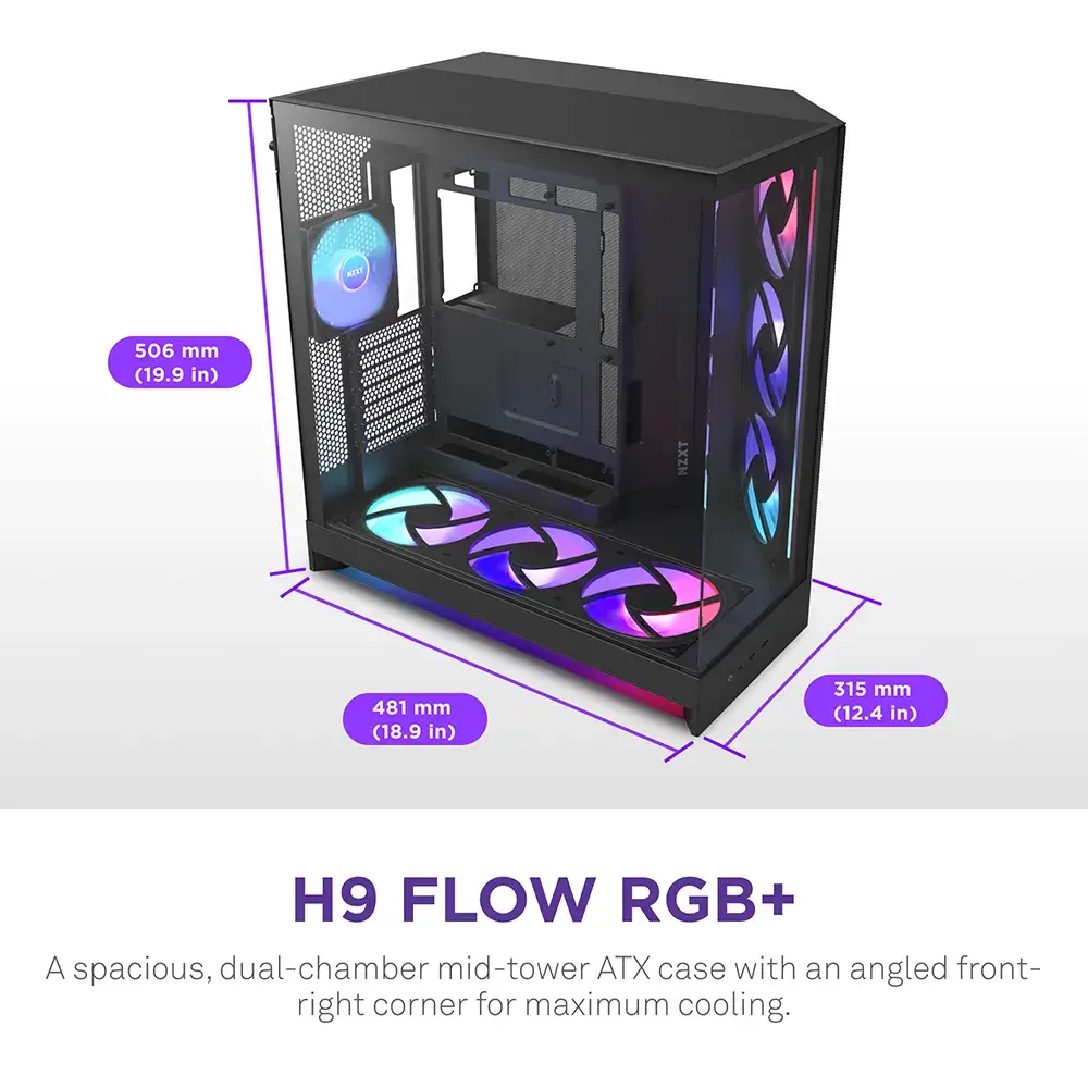 Este produto no momento não temos em stock, se tiver interesse em comprá-lo entre em contato conosco clicando aqui!H9 Flow é uma caixa espaçosa com duas câmaras, concebida para configurações de alto desempenho, com amplo suporte de refrigeração e painéis de vidro envolventes para uma visão ininterrupta da sua configuração. Especificações: Principais: Suporte para motherboards: Extended-ATX ATX Micro-ATX Mini-ITX Material da caixa: Aço SGCC Vidro temperado Compatibilidade/Espaço: Altura do cooler do CPU: 165 mm Comprimento da GPU: Até 459 mm (com ventoinhas de <56 mm de espessura instaladas) Até 410 mm (com AIO de 56 mm de espessura e 420 mm e ventoinhas instaladas na parte frontal direita) Comprimento da PSU: 200 mm Slots de expansão: 7 Portas I/O: 2x USB-A 3.2 Gen 1 1x USB-C 3.2 Gen 2x2 Baías para discos: 4x 2.5" 2x 2.5"/3.5" Suporte para ventoinhas: 1 x 120 mm 9 x 120 mm / 9 x 140 mm Ventoinhas incluídas: 1 x 120 mm com LEDs RGB endereçáveis 6 x 140 mm com LEDs RGB endereçáveis Dimensões e peso: Altura (com pés): 506 mm Largura: 315 mm Profundidade: 481 mm Peso: 13.4 kg
