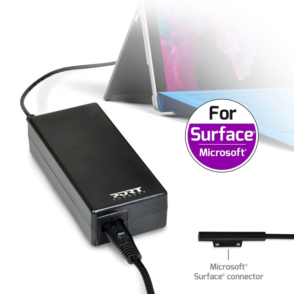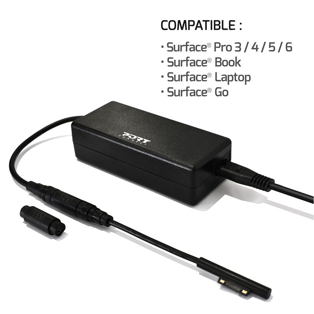 Fonte de alimentação para Microsoft® Surface® até 60W Compatível com Microsoft® Surface® Pro 3 / 4 / 5 / 6, Surface® Book, Surface® Laptop & Surface® GO Proteção adaptável de potência de saída e sobretensão 2 fichas de conversão de tensão DC (12 V & 15 V) 2.5 m de comprimento do cabo de alimentação (2 x 1.2 m)