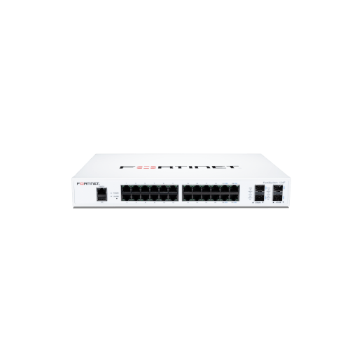 FS-124F | Fortinet FortiSwitch-124F The FortiSwitch™ Secure Access Family delivers outstanding security, performance, and manageability. Secure, simple, and scalable, FortiSwitch is the right choice for threat conscious businesses of all sizes. Features FortiSwitch-124F is a performance/price competitive switch with 24x GE port + 4x SFP+ port + 1x RJ45 console. Fanless design. Highlights Designed for installations from desktops to wiring closets Ideal for SD-Branch deployments Centralized security and access management from FortiGate interfaces with FortiLink Optimal for converged network environments; enabling voice, data, and wireless traffic to be delivered across a single network Supports non-FortiLink deployments through onboard GUI, API, or command line configuration Up to 48 ports in a compact 1 RU form factor Stackable up to 300 switches per FortiGate, depending on model Supports Wire-speed switching and Store and Forward forwarding mode