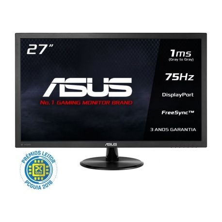 VP278QG - Gaming Monitor 27'' FHD (1920x1080). 1ms. up to 75Hz. DP. HDMI. D-Sub. FreeSync. Low Blue Light. Flicker Free. TUV cer Monitor Gaming ASUS VP278Q de 27" Full HD com resolução de 1920 x 1080. Este monitor contém 1ms de tempo de resposta, 75Hz de taxa de actualização, tecnologia Flicker Free e filtro de Blue Light.