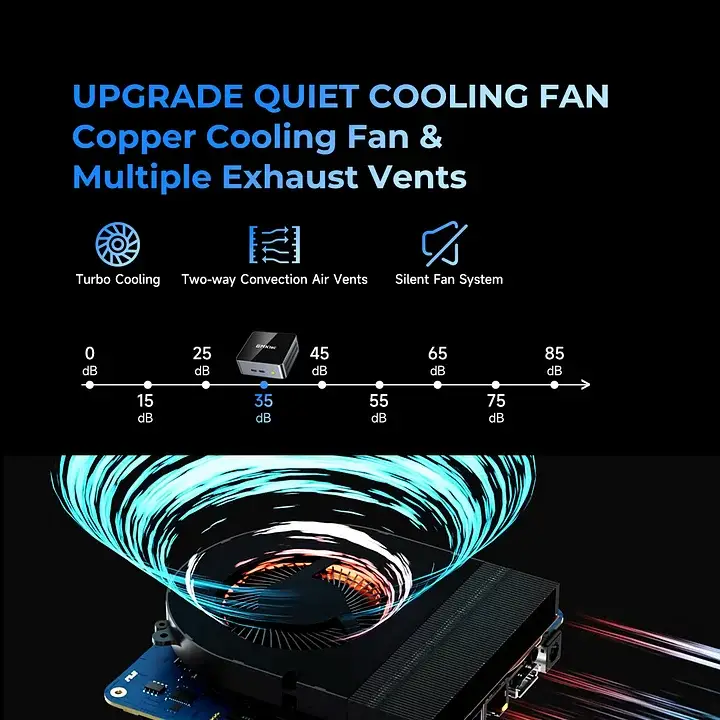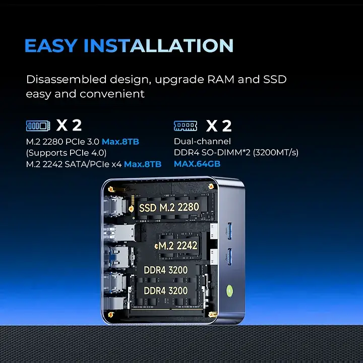 Um dos computadores mini PC mais vendidos do mercado; Processador Intel Twin Lake N150 (4 cores/4 threads, até 3.6 GHz); Dimensões compactadas e com suporte à norma VESA; Conectividade Dual HDMI 2.0 para até dois ecrãs 4K a 60 Hz para multitarefa; Conectividade Wi-Fi 6 e Bluetooth 5.2 para conexões sem-fio modernas; Porta Ethernet 2.5 Gb para rede cabo ultrarrápida; 4 x portas USB 3.2 (até 5 Gbps) e uma porta de áudio de 3.5mm; Refrigeração eficiente com ventoinha silenciosa e heat pipes;