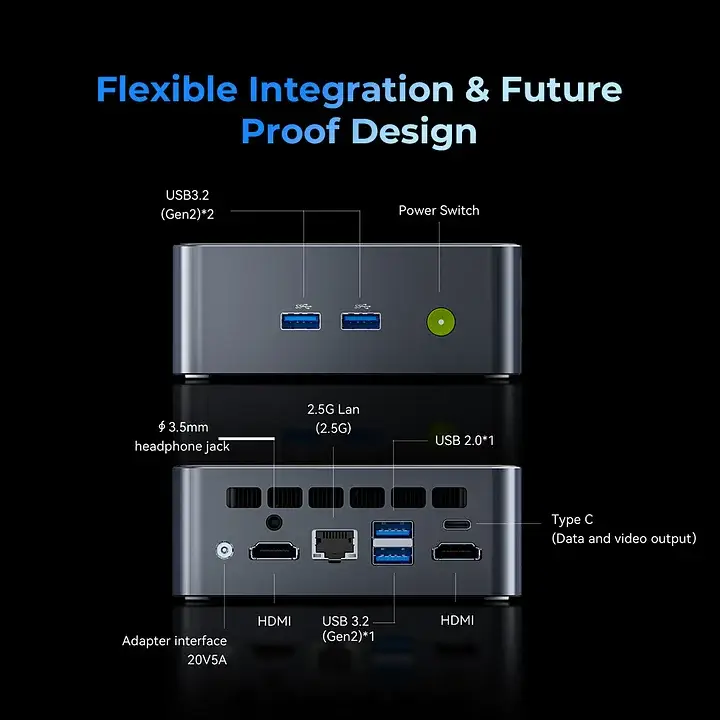 Um dos computadores mini PC mais vendidos do mercado; Processador Intel Twin Lake N150 (4 cores/4 threads, até 3.6 GHz); Dimensões compactadas e com suporte à norma VESA; Conectividade Dual HDMI 2.0 para até dois ecrãs 4K a 60 Hz para multitarefa; Conectividade Wi-Fi 6 e Bluetooth 5.2 para conexões sem-fio modernas; Porta Ethernet 2.5 Gb para rede cabo ultrarrápida; 4 x portas USB 3.2 (até 5 Gbps) e uma porta de áudio de 3.5mm; Refrigeração eficiente com ventoinha silenciosa e heat pipes;