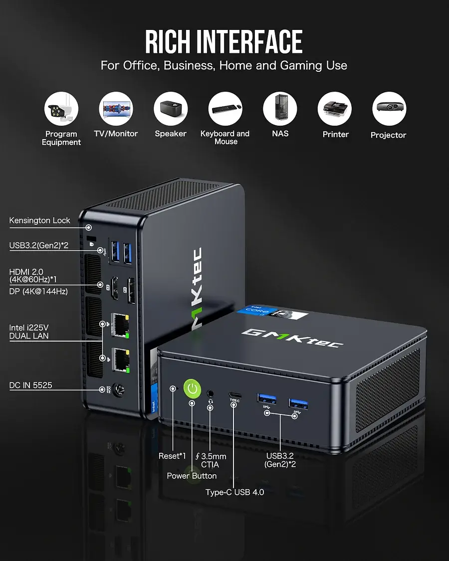Este produto no momento não temos em stock, se tiver interesse em comprá-lo entre em contato conosco clicando aqui!O GMKtec K7 Plus é um mini PC de altíssimo desempenho com design compacto e acabamento premium. É alimentado por um potente Intel Core i7-13620H (13ª geração, 10 núcleos/16 threads, Turbo até 4.9 GHz), perfeito para multitarefa, produtividade exigente e media avançada. Conta com RAM DDR5 (dual-channel), expansível até 64 GB, além de um SSD de 1 TB com dual slots M.2 PCIe 4.0 suportando até 8 TB no total. Permite suporte a três monitores 4K simultâneos via HDMI, DisplayPort e USB-C (USB4 com suporte DisplayPort e até 8K@60 Hz). Equipado com Wi-Fi 6, Bluetooth 5.2, USB 3.2 Gen 2, USB4, HDMI 2.0, DisplayPort 1.4, e duas portas RJ-45 2.5 GbE, oferece conectividade excepcional. O seu design compacto e leve e com suporte VESA, permite instalação discreta e portátil – ideal para home office, media center ou aplicações empresariais. O sistema vem com Windows 11 Pro pré-instalado e é ótimo para ambientes exigentes que exigem rendimento sólido num formato compacto. Processador: Intel® Core™ i7-13620H 10-Core, 3.60 GHz com Turbo até 4.90 GHz, 24 MB Cache Sistema Operativo: Windows 11 Pro Memória RAM: 32GB (2x16GB) DDR5 4800MHz 2 x Slots SO-DIMM (ocupados) p/ expansibilidade total até 64GB Placa Gráfica: Intel® UHD Graphics Armazenamento: SSD 2TB M.2 2280 PCIe 3.0 NVMe 1 x Slot (livre) M.2 2280 PCIe 4.0 NVMe Comunicações: Wi-Fi 6 (AX201) + Bluetooth 5.2 LAN Ethernet Gigabit 2.5G Portas I/O Frontais: 2 x USB 3.2 Type-A 1 x USB 4.0 Type-C 1 x Jack 3.5mm Portas I/O Traseiras: 2 x USB 3.2 (Gen2) Type-A 1 x HDMI 2.0 (4K@60Hz) 1 x DisplayPort (4k@144Hz) 2 x RJ45 LAN (Intel i225V) 1 x DC IN Dimensões: 128.8 x 127 x 47.8mm