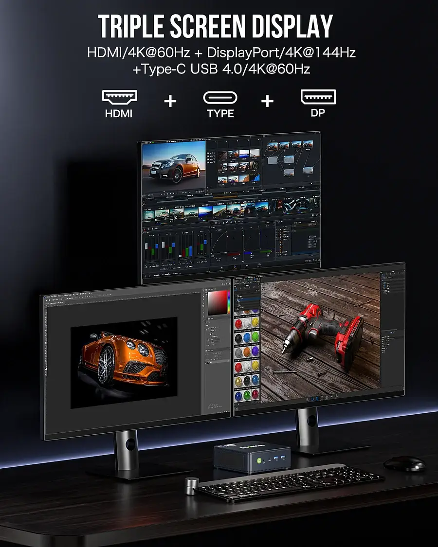 Processador Intel Core i7-13620H (10C/16T, até 4.9 GHz); Suporte a triple display 4K ou até 8K via USB4; Conetividade Wi-Fi 6 e Bluetooth 5.2; Duas portas RJ-45 2.5 GbE para rede ultrarrápida; Saídas HDMI 2.0, DisplayPort 1.4 e USB4; Design compacto e leve; Montagem discreta com suporte VESA incluído; Windows 11 Pro pré-instalado e pronto a usar.