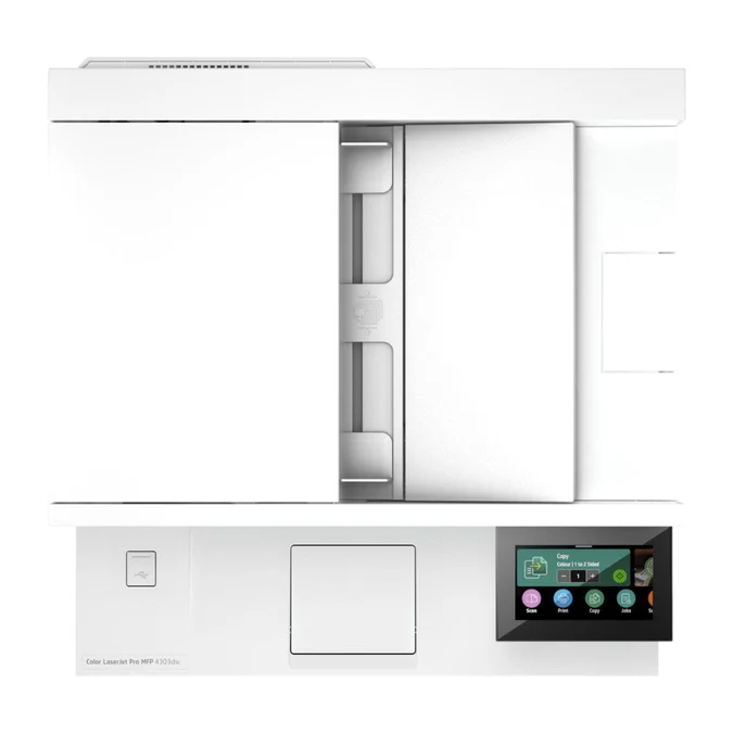 Features Wireless; Print from phone or tablet; Automatic document feeder; Two-sided printing Print, copy, scan Print speed up to 33 ppm black & color (A4) Up to 600 x 600 dpi; Up to 38,400 x 600 enhanced dpi HP Color LaserJet Pro MFP 4303fdn (Exosphere), left facing Maximum color performance for the large workteam Print in color from anywhere with blazing fast speed and self-healing WiFi. Get more done with smart productivity features Get more done with smart productivity features and simple shortcuts, available from anywhere at any time. Set up and manage from a single dashboard Advance your security with HP Wolf Pro Advance your security with HP Wolf Pro security, instantly embedded and preconfigured out of the box. HP Color LaserJet Pro MFP 4303dw (Exosphere), rear facing Fast color printing and easy management tools. Blazing fast speed - Step up your workflow with blazing fast speed to meet high-demand environments. Flexible connectivity - Connect your way. Choose between Ethernet or self-healing, dual-band Wi-Fi that helps you to stay on-line. True-to-life colors - Look professional on every page with high-quality printing, true-to-life colors and sharp details. HP Web Jetadmin - Centralize your printer management. HP Web Jetadmin easily adds and updates devices and solutions. Technical Specification Product: HP LaserJet Pro MFP 4303dw Colour Printer Functions: Print, copy, scan Print speed black (ISO, A4): Up to 33 ppm First page out black (A4, ready): As fast as 9.5 sec First page out color (A4, ready): As fast as 10.5 sec Duplex printing: Automatic Duty cycle (monthly, A4): Up to 50,000 pages Recommended monthly page volume: 750 to 4,000 Print quality black (best): Up to 600 x 600 dpi; Up to 38,400 x 600 enhanced dpi Print quality color (best): Up to 600 x 600 dpi Print technology: Laser Connectivity, standard: 1x Bluetooth Low Energy 1x Gigabit Ethernet 10/100/1000 Base-TX network 1x Hi-Speed USB 2.0 (device) 1x Hi-Speed USB 2.0 (host) 1x Wi-Fi 802.11ac (dual band) 1x Wi-Fi Direct Walk-up USB Auto-crossover Ethernet Display: 4.3” diagonal WLED-backlit anti-glare (480X272) Processor speed: 1200 MHz Memory: 512 MB NAND Flash, 512 MB DRAM Storage: Optional Job Storage via external rear host USB port (minimum 16 GB) Paper handling input, standard: 50-sheet multipurpose tray, 250-sheet input tray, 50-sheet Automatic Document Feeder (ADF) Paper handling output, standard: 150-sheet output bin Paper handling input, optional: Optional 550-sheet tray Finished output handling: Sheet feed Scanner type: Flatbed, ADF Scan resolution, optical: Up to 1200 dpi Automatic document feeder capacity: Standard, 50 sheets uncurled Duplex ADF scanning: No Scan technology: Contact Image Sensor (CIS) Copy resolution (black text): Up to 600 x 600 dpi Copy resolution (color text and graphics): Up to 600 x 600 dpi What's in the box HP Color LaserJet Pro 4303dw Printer 4x preinstalled HP LaserJet Toner cartridges (Black: 2,000 pages, Introductory-Cyan, Magenta, Yellow: 1,000 pages) In-box documentation (Reference Guide, Setup Card) Power cord