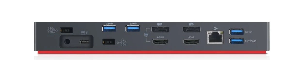 Lenovo ThinkPad Thunderbolt 3 Workstation Gen 2. Tecnologia de conetividade: Com fios, Interface do host: Thunderbolt 3. Taxa de transferência de dados Ethernet LAN: 10,100,1000 Mbit/s. Cor do produto: Preto, Resolução digital máxima: 3840 x 2160 pixels, Compatibilidade da marca: Lenovo. Sistema operativo Windows compatível: Windows 10. Largura: 220 mm, Profundidade: 80 mm, Altura: 30 mm