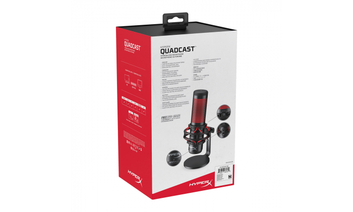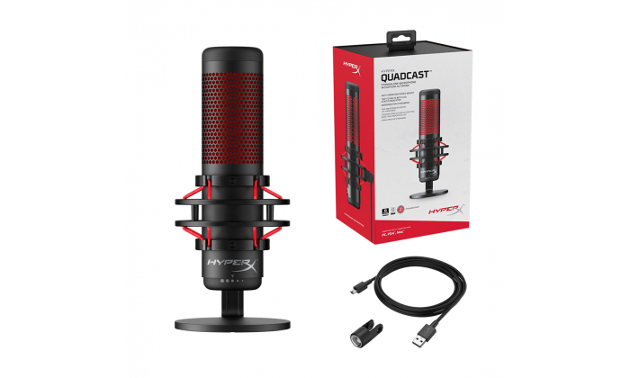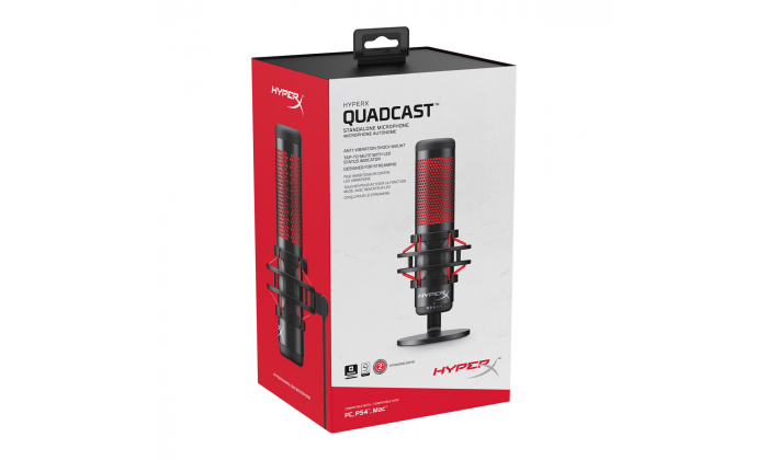 O HyperX QuadCast™ é o microfone independente com todos os recursos para o streamer ou podcaster que procura um microfone com som de qualidade. O QuadCast vem com a sua própria base 'shock mount' antivibração para ajudar a reduzir os ruídos da vida diária e um filtro integrado para amortecer sons percussivos desagradáveis. Saiba instantaneamente o status do seu microfone com o indicador em LED e simplesmente toque para coloca-lo em mudo para evitar acidentes inconvenientes na transmissão. Selecione entre os quatro padrões polares (estéreo, omnidirecional, cardióide, bidirecional) e use o prático botão de controle para ajustar rapidamente a sensibilidade de entrada do seu microfone. O adaptador de montagem incluído que se adapta a tamanhos de fio de 3/8 e 5/8 pol. é compatível com a maioria dos pedestais. Monitorize o som do seu microfone com a entrada do fone de ouvido integrada. O QuadCast é certificado pela Discord e TeamSpeak™ para que você possa garantir que o seu microfone esteja transmitindo alto e claro para todos os seus seguidores e ouvintes. Conectando-se a um PC, PS4™ ou Mac® você poderá transmitir um som de qualidade para quem estiver sintonizado. Microfone: Consumo de Energia: 5V 125mA Taxa de bits/amostra: 48kHz/16-bit Elemento: Microfone condensador Electret Tipo de condensador: Três condensadores de 14 mm Padrão polar: Estéreo, Omnidirecional, Cardióide, Bidirecional Resposta de frequência: 20Hz–20kHz Sensibilidade: -36dB (1V/Pa a 1kHz) Comprimento do cabo: 3 m Saída de áudio: Impedância: 32 Ω Resposta de frequência: 20Hz - 20kHz Máxima saída de energia: 7mW THD: ≤ 0.05% (1kHz/0dBFS) SNR: ≥ 90dB (1kHZ, RL=∞)