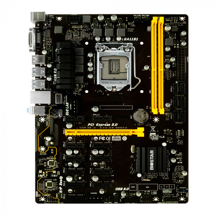 A motherboard nº 1 do mundo, TB250-BTC PRO com suporte até 12 slots PCI-e nativos com 12 placas gráficas, está oficialmente disponível no mercado. TEMPO É DINHEIRO! Em comparação com as duas máquinas com TB250-BTC, uma máquina mining definitiva com TB250-BTC PRO aumenta com eficiência o desempenho mining até 200% para maximizar o seu lucro e faz com que gaste muito menos tempo. TB250-BTC PRO traz velocidade de mining 2 vezes mais rápida para aumentar o hashrate muito mais alto e torna o desempenho de mining mais eficiente; ou seja, pode obter retorno em apenas 79 dias. DESIGN ELEGANTE DE LAYOUT DE SLOT BIOSTAR produz exclusivamente o layout incrível e elegante dos slots PCI-e, uniformemente equipados na motherboard para evitar curto-circuito durante o mining. Não há mais problemas de curto-circuito para incomodar um minerador profissional por uma mining contínua de dinheiro de forma estável. PCI-E NATIVO PARA MELHOR COMPATIBILIDADE 12 slots PCI-e do TB250-BTC PRO são totalmente PCI-e nativos do chipset Intel B250 mais recente. Esta especificação é surpreendentemente superior a algumas das motherboards de mining com solução de ponte PCI-e para expandir mais slots para as suas chamadas motherboards de mining, embora os mineradores tenham alguns problemas de incompatibilidade e baixa estabilidade com este tipo de motherboard de mining. Para finalizar, BIOSTAR TB250-BTC PRO está equipado com o mais recente chipset Intel B250 e outros no mercado são chipset Intel H110. BIOSTAR TB250-BTC PRO BIOSTAR TB250-BTC PRO usa chipset Intel B250 com suporte a PCI-e nativo de até 12 slots. Cada slot tem um canal dedicado que torna o mining mais fácil. SUPORTE PARA PLACA GRÁFICA HÍBRIDA BIOSTAR TB250-BTC PRO é compatível com a plataforma de placa de vídeo híbrida e agora pode facilmente configurar a GPU híbrida, como 6 peças do AMD RX 470 e 6 peças da NVIDIA GTX 1060. Outros ainda estão à espera, mas você está pronto para ganhar muito dinheiro dia e noite. ESPECIFICAÇÕES Processadores suportados: 7ª & 6ª Ger. Intel® Core™ i7 LGA 1151 7ª & 6ª Ger. Intel® Core™ i5 LGA 1151 7ª & 6ª Ger. Intel® Core™ i3 LGA 1151 7ª & 6ª Ger. Intel® Pentium® LGA 1151 7ª & 6ª Ger. Intel® Celeron® LGA 1151 Chipset: Intel B250 Memória RAM: Suporta Dual Channel DDR4 2400/ 2133/ 1866 MHz 2 x Slot de memória DDR4 DIMM Suporta até 32 GB de memória Armazenamento: 6 x SATA III Connector Áudio: ALC887 Suporta High Definition Audio Portas USB: 4 x USB 3.0 Port 1 x USB 3.0 Header 2 x USB 2.0 Port 2 x USB 2.0 Port(only 5V power, up to 1.5A) 2 x USB 2.0 Header Portas I/O Painel Traseiro: 1 x PS/2 Mouse 1 x PS/2 Keyboard 4 x USB 3.0 Port 2 x USB 2.0 Port 2 x USB 2.0 Port(only 5V power, up to 1.5A) 1 x DVI-D Connector, resolution up to 1920 x 1200 @60Hz 1 x LAN Port 3 x Audio Jacks Portas Internas I/O: 1 x USB 3.0 Header 2 x USB 2.0 Header 6 x SATA III Connector (6Gb/s) 1 x SATA Power Connector(for rear USB power enhancement) 1 x Front Audio Header 1 x Front Panel Header 1 x CPU Fan Connector 2 x System Fan Connector 2 x PCI-E 12V 4Pin Connector(Must be installed when using for bitcoin mining.) 1 x COM Port Header Dimensões: Formato ATX, 29.5cm x 21cm