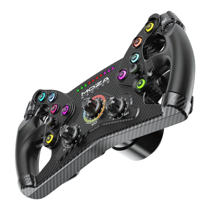Carbon Fiber Reinforced Composites The KS wheel case is made of carbon fiber reinforced composites, offering a strong and durable texture. It ensures ultimate firmness and security during sharp turns with its strengthened quick-release connection structure, reinforced with high-strength steel. 300mm Butterfly Style GT Wheel The KS is MOZA's GT style racing wheel. With its sleek butterfly design and 300mm size, this wheel is built to deliver the ultimate immersion and realism. An Open Ecosystem The MOZA KS wheel is the epitome of versatility, designed to work seamlessly with all MOZA wheelbases while also being compatible with 3rd party wheelbases via an adapter to directly connect the PC. Programmable 0.25mm Short Travel RGB Buttons The KS wheel features 10 RGB buttons with 0.25mm short travel and 8 customizable colors. It provides lightning-fast responsiveness and authentic force. Transparent button stickers are included for easy customization and to add a high-tech feel to your setup. Programmable 0.25mm Short Travel RGB Buttons The KS wheel features 10 RGB buttons with 0.25mm short travel and 8 customizable colors. It provides lightning-fast responsiveness and authentic force. Transparent button stickers are included for easy customization and to add a high-tech feel to your setup. 8-Color RPM LED Light The KS wheel features 10 high-brightness LED lights that allow customization of up to 8 colors, offering an impressive 100 million combinations. But that's not all - with the added ability to customize the RPM indicator switch mode and timing, you'll have complete control over your racing setup. Hall Sensor Magnetic Paddle with Dual Clutch The KS magnetic paddles are crafted from durable anodized aluminum, offering a sleek and premium look. They feature non-contact hall sensors with 0.03mm precision for stable and precise control. The paddles have pre-installed silencer pads for smooth and noise-free shifting. Light Weight Design The KS wheel weighs only 1220g due to lightweight materials and optimized structure. This low weight improves responsiveness and allows accurate replication of road textures and details. TPE Rubber Grips The TPE grips offer a soft and precise feel, along with superior grip and high friction forces for accurate steering control. They are coated with a corrosion-resistant material to enhance durability and protect against wear and tear. MOZA Quick Release MOZA's quick release system ensures a seamless wheel transition in seconds. Enjoy a stable, solid connection that works across the whole MOZA ecosystem. MOZA Pit House Control Suite The Pit House steering wheel control page features a user-friendly interface that allows you to test the functionality of your wheel, adjust settings for dual-clutch paddle mode, and select between knob and joystick modes. You can also customize the gear shift indicator light color, brightness, and timing, and adjust button colors. Ergonomic Design Well-positioned joysticks, buttons, and switches allow quick and intuitive access to adjustments during intense gameplay. The indentations on the grips ensure a secure hold, with or without gloves. Three 12-position Rotary Encoders, Two 20-position Thumb Encoders, 2 Depressible Joysticks, and 70 Programmable Input Signals The MOZA KS offers 70 fully programmable input signals for all driving needs. It features thumb and rotary encoders for faster on-the-fly car adjustments, including brake bias, traction control, engine maps, ABS, and more. The two joysticks enable full menu navigation, keeping your hands on the wheel and eyes on the road. Specifications: Device type: Steering wheel Gaming platforms supported: PC Connectivity technology: Wired Product colour: Black Housing material: Aluminium Compatibility: Assetto Corsa Assetto Corsa Competizione Dirt Rally Dirt Rally 2.0 Dirt 4 F1 2018 F1 2019 F1 2020, etc Width: 300 mm