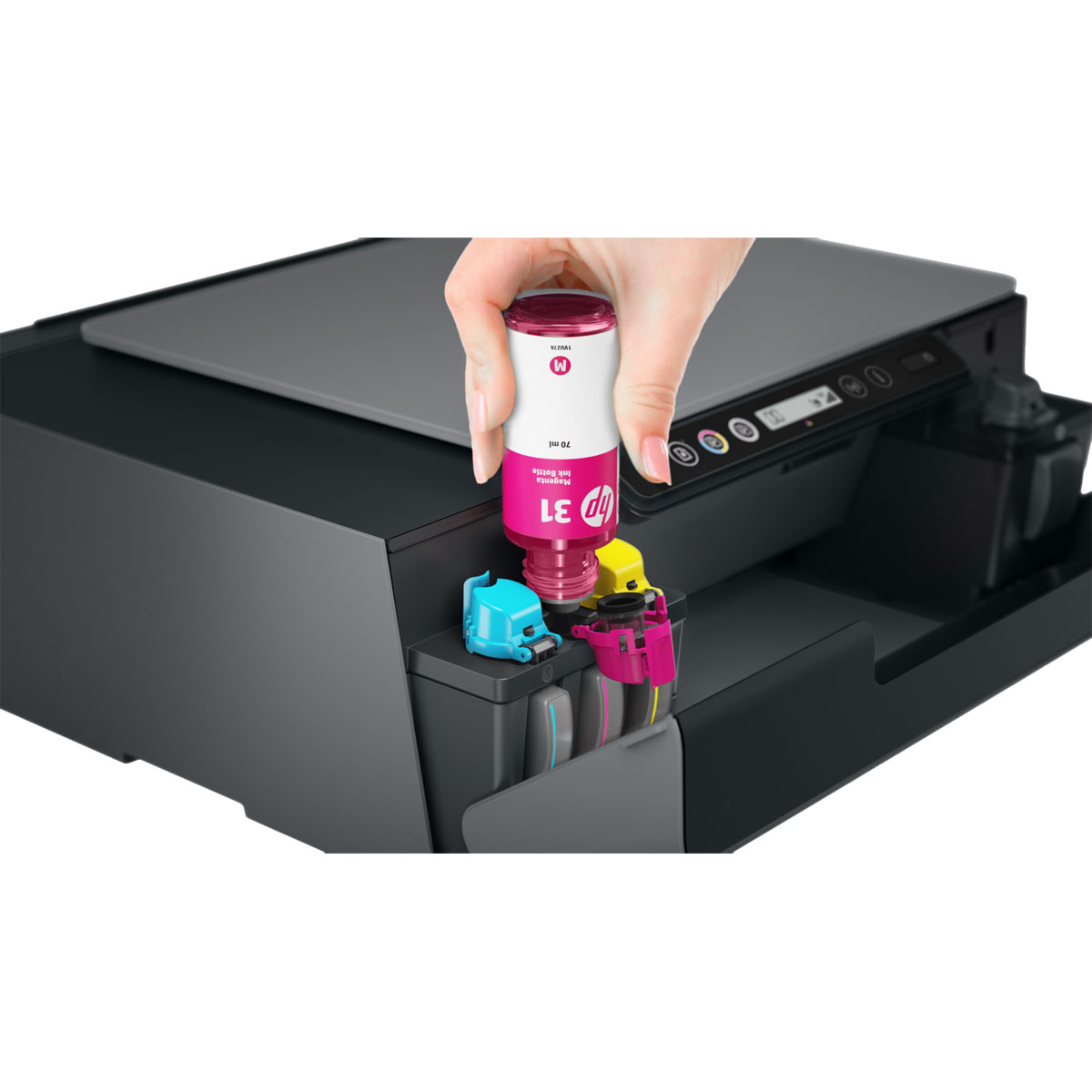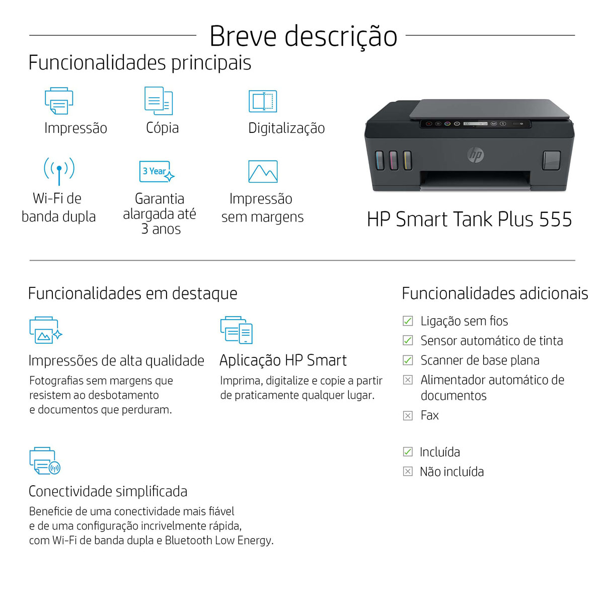 Esta impressora sem tinteiros, com um alimentador automático de documentos, oferece uma qualidade de impressão excecional. Usufrua de ligações mais rápidas com Wi-Fi de banda dupla, e de impressão móvel simplificada com a aplicação HP Smart. Impressão, cópia, digitalização, sem fios Configuração fácil e rápida Experiência de enchimento limpa e fácil Impressão móvel e sem fios Tintas de alta qualidade para impressões que duram e perduram Custo de impressão extremamente baixo PAGUE ADIANTADO E POUPE NA IMPRESSÃO EM CASA Imprima até 12 000 páginas a preto ou até 8000 páginas a cores. Imprima documentos com texto nítido e carregado, bem como gráficos e imagens com cores vibrantes. Imprima documentos com rapidez – velocidades até 38% mais rápidas em comparação com as da HP Smart Tank anterior. Encha facilmente o seu reservatório de tinta com frascos reutilizáveis, à prova de derrames. IMPRESSÃO E DIGITALIZAÇÃO REMOTA COM A APLICAÇÃO HP SMART Aceda rapidamente aos documentos e imagens e imprima-os no seu smartphone, a partir da Dropbox e Google Drive. Usufrua de digitalização de alta qualidade e partilhe através da Dropbox, Google Drive, por e-mail ou nuvem. Tire uma fotografia como cópia e envie-a para a sua impressora, a partir de praticamente qualquer lugar. Receba notificações quando imprime, digitaliza ou copia a partir do seu smartphone. CONECTIVIDADE FIÁVEL COM WI-FI DE BANDA DUPLA Usufrua de ligações mais rápidas e mais fiáveis com Wi-Fi® de banda dupla. Ligue o seu smartphone ou tablet diretamente à sua impressora e imprima facilmente sem aceder a uma rede. Ligue-se e comece a imprimir rapidamente a partir do seu smartphone ou tablet com Bluetooth® Low Energy graças à configuração fácil. Aceda a funcionalidades de que necessita para trabalhar e para executar outras tarefas com as funções de cópia e digitalização. Funções: Funções: Impressão, digitalização, cópia, ligação sem fios Impressão: Velocidade de impressão a preto: ISO: Até 11 ppm / Rascunho: Até 22 ppm Velocidade de impressão a cores: ISO:Até 5 ppm / Rascunho:Até 16 ppm Saída da primeira página (pronta): Preto: Em apenas 14 seg. / Cor: Em apenas 20 seg. Ciclo de produtividade (mensal, A4): Até 1000 páginas Volume mensal de páginas recomendado: 200 a 800 Tecnologia de impressão: Jacto de Tinta Térmico HP Controladores da impressora incluídos: HP PCL 3 GUI Ecrã: Ecrã de 5,08 cm (2 pol.) com ícones e 7 segmentos Velocidade do processador: 1,2 GHz Número de tinteiros: 4 (1 frasco de tinta preta, conjunto de 3 frascos de tinta de cor) Linguagens de impressão: HP PCL 3 GUI Sensor automático de papel: Não Conectividade: Capacidade sem fios: Sim, Wi-Fi 802.11b/g/n de banda dupla incorporado, Wireless Direct, BLE Conectividade, padrão: Porta USB 2.0 Hi-Speed, Wi-Fi de banda dupla com Bluetooth Low Energy Memória: Memória, padrão: 256 MB Memória, máximo: 256 MB Scanner: Tipo de scanner: Base plana, ADF Formatos dos ficheiros digitalizados: JPG, BMP, TIFF, PDF, RTF, TXT, PNG Resolução de digitalização, óptica: Até 1200 ppp Profundidade de bits: 24 bits Tamanho da digitalização, máximo: 216 x 297 mm Tamanho da digitalização (ADF), máxima: 216 x 356 mm Capacidade do alimentador automático de documentos: De série, 35 folhas Fotocopiadora: Velocidade de cópia (rascunho): Preto: Até 22 cpm / Cor: Até 14 cpm 4 Resolução de cópia (texto a preto): Até 600 ppp Resolução de cópia (gráficos e texto a cores): Até 600 ppp Definições de redução/ampliação de cópias: 25 até 400% Cópias, máximo: Até 99 cópias Dimensões e peso: Dimensões mínimas (L x P x A): 447 x 373 x 158 mm Dimensões máximas (L x P x A): 449 x 605,65 x 258,7 mm Peso: 5,14 kg Conteúdo da Embalagem: Multifunções HP Smart Tank Plus 555 Wireless 2 Frascos de Tinta HP Originais 32XL Preto (135 ml) Frasco de Tinta HP Original 31 Ciano (70 ml) Frasco de Tinta HP Original 31 Magenta (70 ml) Frasco de Tinta HP Original 31 Amarelo (70 ml) Folheto com advertências relativas aos tinteiros/frascos de tinta Folheto de reacondicionamento Guia de configuração Guia de referência Folheto com informações regulamentares Folheto PT Folheto com informações regulamentares sobre a RoH-EAC Cabo de alimentação