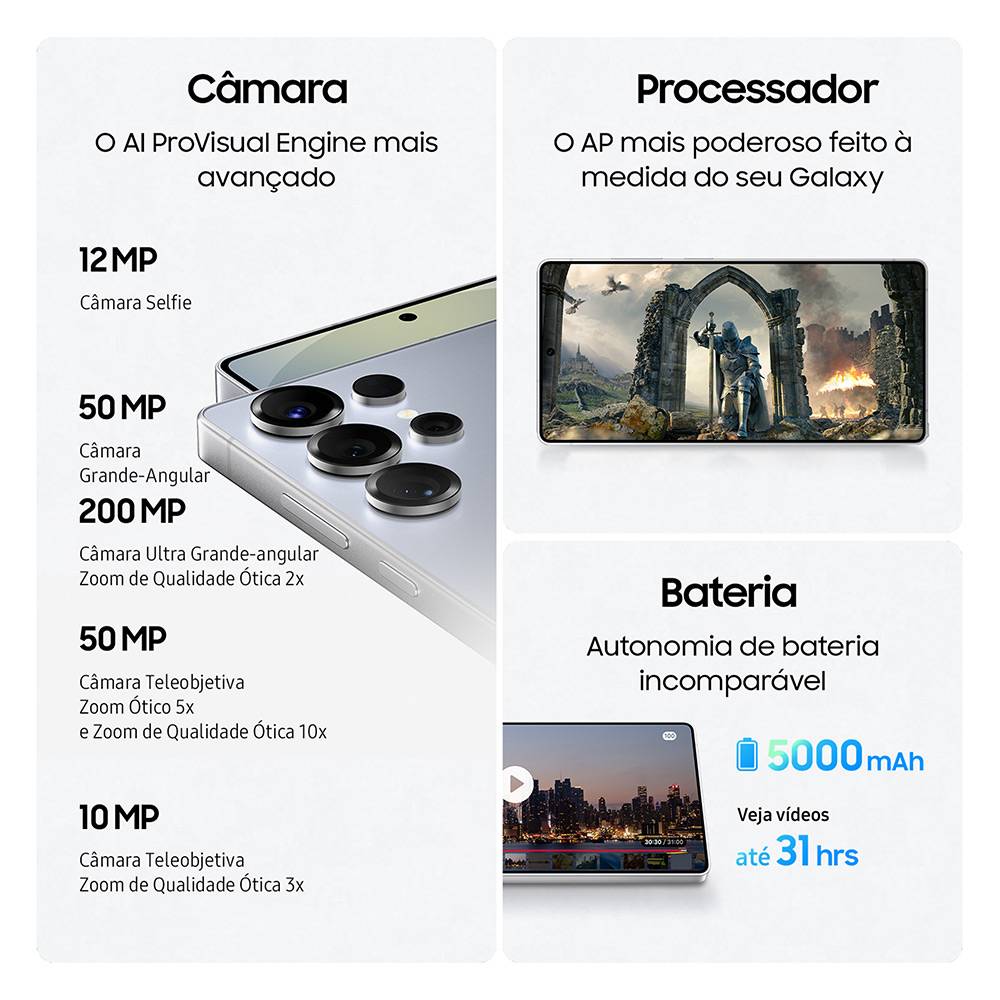 O Galaxy AI agora analisa os teus padrões para mostrar informações úteis; Corpo em Titânio, 56% mais resistente; Design Icónico da serie Ultra com S Pen; CPU com tecnologia 3nm para oferecer desempenho máximo e eficiência; Ecrã Dynamic AMOLED 2X com até 2.600 nits de brilho; A tecnologia de câmara mais avançada; Nova lente ultra grande angular de 50MP; Photo Assist para edição de fotos como um profissional.