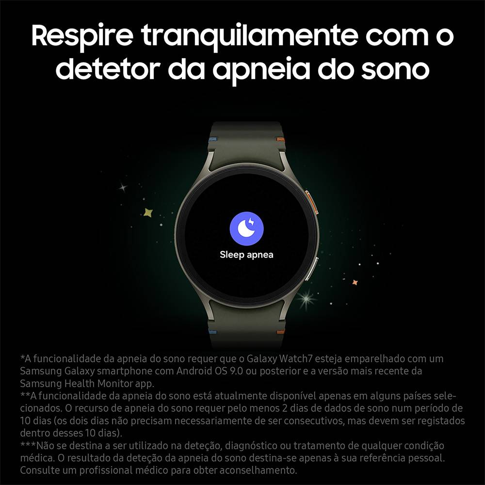 O SEU COMPANHEIRO DE SAÚDE PERFEITO Apresentamos novo Galaxy Watch7. Disponível em dois tamanhos, para se adaptar melhor ao seu pulso e estilo de vida. O Galaxy Watch7 será capaz de monitorizar a sua vida diária e fazer sugestões para melhorar a sua qualidade de vida graças às suas funções de IA. ESCOLHA ENTRE OS DOIS TAMANHOS DISPONÍVEIS Com uma visualização perfeita da interface. O Galaxy Watch7 tira o máximo partido das molduras para integrar um ecrã de 1.31" (40mm) e 1.47" (44mm). Os ícones e a interface terão um melhor aspeto e pode tirar partido do tamanho maior para, por exemplo, responder a mensagens com um teclado completo no ecrã. MELHORE O SEU DESCANSO COM IA Descansar na quantidade certa faz toda a diferença. Todos os atletas compreendem a importância de um bom descanso para recuperar após um treino intenso, e é por isso que o Galaxy Watch7 integra IA para melhorar a nossa análise do sono e dar-nos recomendações para o dia seguinte. EXPERIÊNCIA DE EXERCÍCIO PERSONALIZADA O Galaxy Watch7 está preparado para todos os entusiastas do desporto que procuram o melhor dos melhores. Graças às suas funcionalidades de análise completa do seu estado físico, consegue realizar exercícios totalmente adaptados a si, ajudando-o a alcançar o seu melhor. DESEMPENHO DE OUTRO NÍVEL O Galaxy Watch7 renova-se por completo para integrar um processador mais potente, um novo sistema de GPS de Frequência Dupla e um novo sensor biométrico. ECOSSISTEMA GALAXY Os nossos dispositivos Galaxy funcionam melhor em conjunto, e o Galaxy Watch7 não é diferente. Responda às suas notificações com respostas rápidas baseadas na sua conversa, controle a câmara do seu smartphone Galaxy ou localize os seus dispositivos com o Samsung Find. Especificações: Materiais: Alumínio Cristal de Safira Ecrã: Tecnologia (Ecrã Principal): Super AMOLED Tamanho (Ecrã Principal): 1.31" Resolução (Ecrã Principal): 432 x 432 (330PPI) Processador: Processador: Exynos W1000 Tipo Processador: 5-Core, 3nm Armazenamento/Memória: Memória: 2GB Armazenamento: 32GB Sistema Operativo: Wear OS Powered by Samsung Conectividade: Tecnologia de Localização: GPS (L1+L5) Wi-Fi: 802.11a/b/g/n 2.4GHz+5GHz Rede móvel: Não NFC: Sim Versão Bluetooth: Bluetooth v5.3 Sensores: Acelerómetro (32G) Barómetro Giroscópio Geo Magnético Luz Ambiente Temperatura Samsung BioActive Sensor Sensor ótico de bio-sinal Sensor Cardíaco Sensor de Bioimpedância Elétrica (BIA) Saúde: Funcionalidades powered by AI Energy Score Notificação de Ritmo Cardíaco Irregular (IHRN) ECG Pressão Arterial Análise de Bioimpedância Elétrica (BIA) Oxigénio no Sangue (SpO2) Temperatura da pele Monitorização do Sono Leitor de Frequência Cardíaca Deteção de Quedas Saúde da Mulher Bateria: Capacidade da Bateria (mAh, Típica): 300 Carregamento: WPC Wireless Charging + Carregamento rápido Durabilidade: 5 ATM + IP68