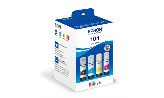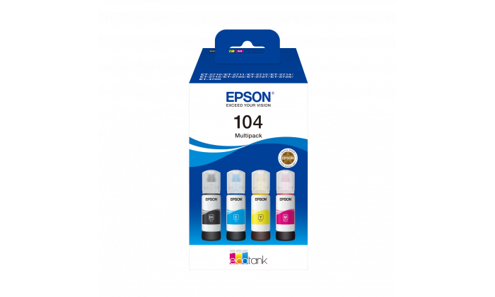 Esqueça as preocupações com a impressão com a série de tintas 104 de quatro cores, concebida para proporcionar uma solução sem complicações de custo ultrarreduzido para a impressão do dia-a-dia. Com um conjunto de tinta, poderá produzir milhares de páginas sem ter de substituir um tinteiro. Quando finalmente é necessário reabastecer, poderá fazê-lo de forma fácil e sem complicações graças às garrafas reformuladas. IMPRESSÃO DO DIA A DIA Quer esteja a imprimir o trabalho escolar ou bilhetes de um voo, esta série de tintas corantes de quatro cores oferece uma solução fiável sem complicações. REDUZA OS CUSTOS DE TINTA Procura uma solução de impressão de custo ultrarreduzido? Poupe em média 90% nos custos da tinta desde o primeiro conjunto incluído com a impressora. Além de económica, é impressionante o número de páginas que um só conjunto consegue produzir: até 4500 páginas a preto e 7500 a cores. CONCEBIDA ESPECIFICAMENTE PARA FACILITAR A UTILIZAÇÃO As garrafas de tinta da Epson são mais fáceis de utilizar do que nunca graças ao design de nova geração. As garrafas reformuladas proporcionam reabastecimentos sem complicações e só permitem a inserção da cor correta no tanque correspondente. APARELHOS PRINCIPAIS COMPATÍVEIS EcoTank ET-4700 Unlimited EcoTank ET-4700 EcoTank ET-2726 Unlimited EcoTank ET-2726 EcoTank ET-2720 Unlimited EcoTank ET-2720 EcoTank ET-2715 EcoTank ET-2714 EcoTank ET-2712 EcoTank ET-2711 EcoTank ET-2710 Unlimited EcoTank ET-2710