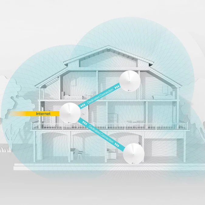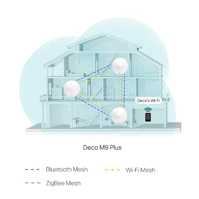 Fast. Smart. Everywhere. Smart Home Mesh Wi-Fi System AC2200 Tri-Band Wi-Fi Deco is the simplest way to guarantee a strong Wi-Fi signal in every corner of your home up to 6,500 square feet. Enjoy fast and secure Tri-Band Wi-Fi no matter how many devices you have. Deco M9 Plus connects and controls your smart home devices as a hub, no need for additional hub. More than Dedicated Wireless Connection Three separate Wi-Fi bands deliver super-fast, stable connections to devices in every room of your home. More bandwidth is freed up with dedicated wireless links between Deco units. Say goodbye to lag with AC2200 Wi-Fi system. Deco M9 Plus uses not only 5G_1(867Mbps) as wireless backhaul but also 5G_2(867Mbps) and 2.4G(400Mbps) as backhaul while traffic gets heavy, delivering speeds over 1000Mbps which is ideal for your gigabit fiber. Dead-zone Killer Eliminate weak signal areas with whole-home Wi-Fi. No more searching around for a stable connection. Want more coverage? Simply add another Deco. No More Buffering Tired of endless loading? With an ever increasing number of bandwidth-hungry gadgets in our homes, you need a network that can rise to the challenge. With network speeds three times faster than the previous generation routers thanks to 802.11ac wireless technology, Deco can provide lag-free connections for over 100 devices. Whole Home Seamless Roaming Deco units work together to form one unified network. Enjoy your smart life not just in your living room, but all around your entire house with Deco M9 Plus’ s smart mesh. The Smart Hub of Your Home Deco M9 Plus acts as a smart home hub, bringing all your products together in one easy-to-use app. Set interactions between Zigbee, Bluetooth and Wi-Fi devices. With Deco M9 Plus, enjoy the magic of the smart home in every room. Great Compatibility TP-Link smart devices, GE, Kwikset and other leading brands are supported, making possible a range of interactions between bulbs, locks, cameras and more. Setup Just Got a Lot Easier Unbox Deco, install the app and then simply follow the on-screen directions. Deco will take care of the rest, getting your network up and running in minutes.