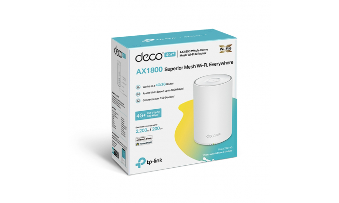 MENOS CONFUSÃO, MAIS COBERTURA WIFI Equipado com um modem 4G+ incorporado, WiFi 6, e tecnologia TP-Link Mesh, o Deco X20-4G proporciona uma partilha da Internet 4G sem complicações com uma experiência superior de rede Wi-Fi em toda a casa. Conecte o seu cartão SIM e desfrute! CONHEÇA O POTENT MESH WIFI 6 Equipado com a tecnologia WiFi 6, o WiFi Deco de rede doméstica inteira foi concebido para dar um enorme impulso na cobertura, velocidade, e capacidade total. Entre na mais recente rede WiFi em malha para desfrutar da futura rede que carrega mais rapidamente e liga mais. 4G+ VELOCIDADE PARA ENTRETENIMENTO DE CONSUMO O gateway Deco X20-4G suporta Cat6 com velocidades de downlink de Internet até 300 Mbps, partilhado por WiFi 6 super-rápido com velocidades até 1,8 Gbps, permitindo actividades online sem atraso, tais como streaming de 4K, jogos de nuvens, e videochamadas. Conecte o seu cartão SIM e desfrute de Internet de alta velocidade. LIGAÇÕES 4G DESBLOQUEADAS EM TODO O LADO A instalação tradicional de banda larga ou cabo é cara e demorada para a sua casa de férias, quinta, ou armazém suburbano. Os longos períodos contratuais também criam dores de cabeça para alugueres curtos, locais pop-up, e lojas temporárias para aceder à Internet. Com os anos de testes de campo da TP-Link e a sua experiência em tecnologia de router 4G, o Deco X20-4G assegura uma instalação de rede confortável e sem bloqueios. Conecte o seu cartão SIM e desfrute de internet de alta velocidade! ROAMING SEM PROBLEMAS COM UM NOME WIFI TP-Link Mesh significa que as unidades Deco trabalham em conjunto para formar uma rede unificada. O seu telefone ou tablet liga-se automaticamente ao Deco mais rápido à medida que se desloca através da sua casa, criando uma experiência WiFi verdadeiramente sem falhas. Especificações: Normas: IEEE 802.11ax/ac/n/a 5 GHz IEEE 802.11ax/n/b/g 2.4 GHz Velocidades: 5 GHz: 1201 Mbps (802.11ax) 2.4 GHz: 574 Mbps (802.11ax) Modos de funcionamento: 3G/4G Router Access Point Processador: 1.5 GHz Quad-Core CPU Portas: 3x RJ45 Gigabit 2x Portas Externas Antena 3G/4G Suporte USB: 12V=1.5A Botões: Reset Segurança: WPA-Personal WPA2-Personal WPA3-Personal Conteúdo da embalagem: 1x Unidade Deco X20-4G 1x Cabo Ethernet RJ45 1x Adaptador de energia 1x Guia de Instalação Rápida 2x Adaptadores SMB para SMA