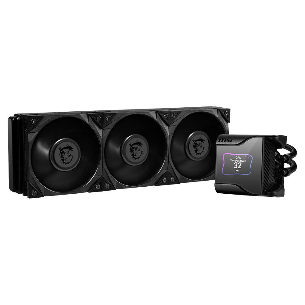 A MEG SILENT GALE P12 da MSI fornece fluxo de ar suficiente para o radiador para refrigeração, mantendo baixos níveis de ruído; Uma ventoinha de 60 mm é colocada dentro do bloco de água para ajudar a dissipar o calor do SSD M.2, VRMs do CPU e componentes ao redor; A MEG SILENT GALE P12 e a ventoinha do bloco de água suportam 0% RPM para garantir zero ruído em baixas temperaturas; O MEG CORELIQUID S Series vem com um display IPS de 2.4” capaz de exibir informações de hardware, GIF, MP4, fotos, te