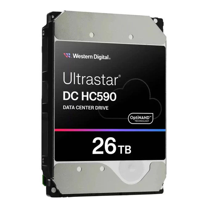 Future of More. Plus One The world’s first 11-disk CMR HDD platform delivers unbeaten capacity of up to 26TB to help quench customer’s insatiable demand for increased storage density in the existing storage footprint. Rapid Qualification and Rock Solid Reliability Leveraging field-proven hardware and firmware designs from generations of highly successful products ensures easy qualification, seamless integration and rapid adoption while maintaining superior dependability and reliability. Maximum Rack-Space Efficiency The higher storage density provided by 11 disks combined with our energy-assisted Perpendicular Magnetic Recording (ePMR) technologies, which increase tracks-per-inch (TPI), allow data centers to maximize their storage efficiency. Protected Against Vibration & Shock Our exclusive Rotational Vibration Safeguard (RVS) uses dual sensors to anticipate and counteract disturbances, maintaining peak performance in high-vibration environments. Combined with Dynamic Fly Height technology, Western Digital offers exceptional drive reliability and protection from unexpected shock events. Engineered with Industry-Leading Technology Western Digital’s proprietary OptiNAND™ technology leverages integrated iNAND® embedded flash to perform key housekeeping functions, freeing up more capacity and improving the overall drive performance. Powerful Performance and Resiliency Choose ArmorCache™ write cache disabled (WCD) mode for increased random write performance or select write cache enable (WCE) mode to protect cached data in case of Emergency Power Off (EPO) or unexpected power loss scenarios. Meet Eco Goals with Helium Choose ArmorCache™ write cache disabled (WCD) mode for increased random write performance or select write cache enable (WCE) mode to protect cached data in case of Emergency Power Off (EPO) or unexpected power loss scenarios. Trusted Reliability, Quality and World-Class Support As an industry-leading hard drive manufacturer, Western Digital stands behind their Ultrastar hard drives with the assurance of a projected 2.5M-hour MTBF rating, a 5-year limited warranty and world-class support services to help create environments for data to thrive. Target Audience Data Center Managers Data Center Architects IT Administrators AI System Administrators Ideal for Hyperscalers and big data applications Artificial Intelligence training pools Cloud repatriation data pools Cloud service providers Converged infrastructures Technical Specification Product: Western Digital DC HC590 Model Number: WUH722626ALE6L4 HDD capacity: 26 TB HDD speed: 7200 RPM HDD size: 3.5" Interface: SATA III 6Gb/s Sector size (bytes): 512e: 512 ; 4Kn: 4096 Data buffer (MB): 512 Recording Technology: CMR Security: SE Weight: 0.67 kg Warranty: 5-Year Limited